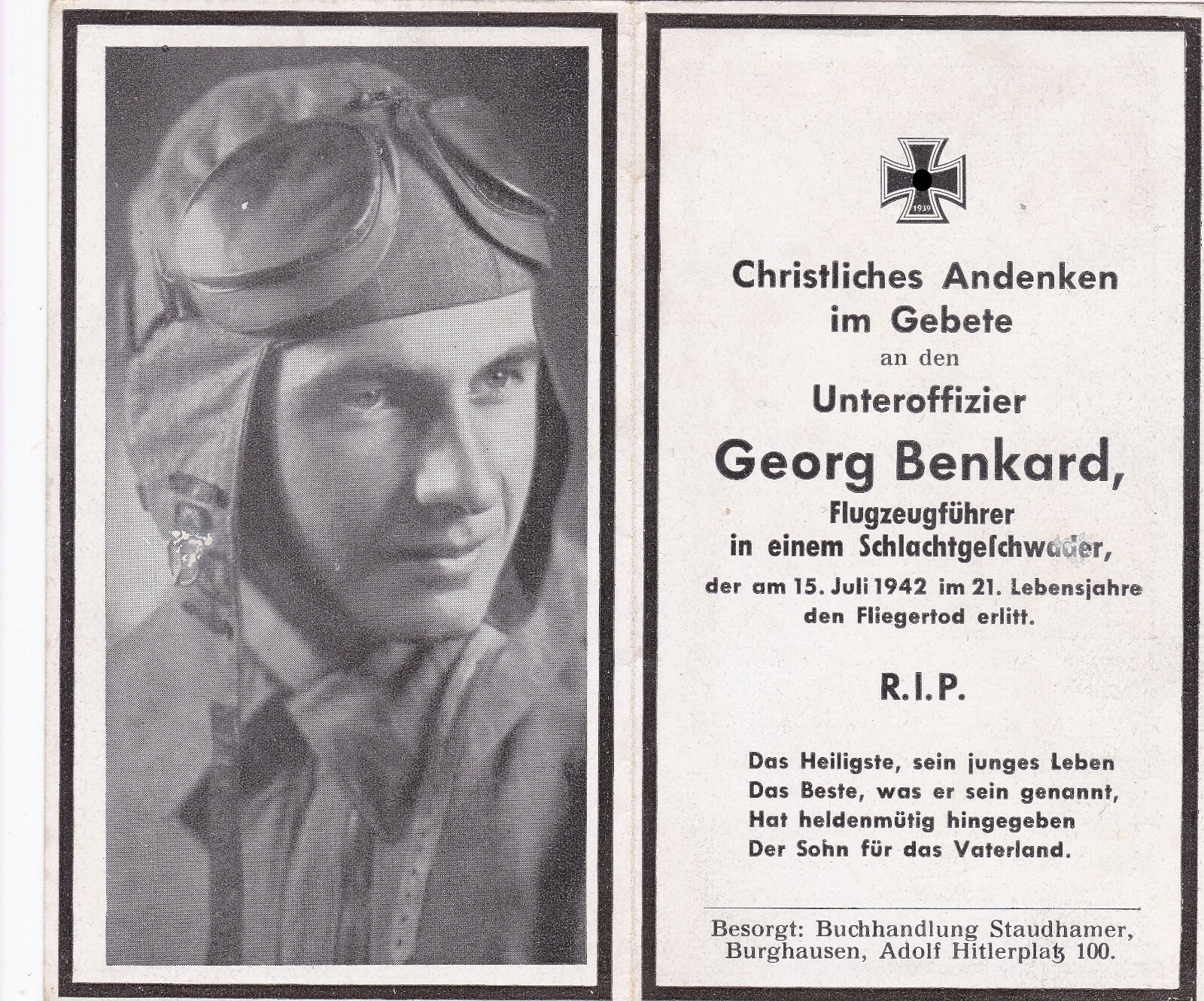 Can anyone supply any further information regarding the loss of Uffz. Georg Benkard who was a pilot killed on the 15.07.1942. I Have a copy of his death card which I hope to use in his page of remembrance. Regards Melvin www.aircrewremembrancesociety.com |