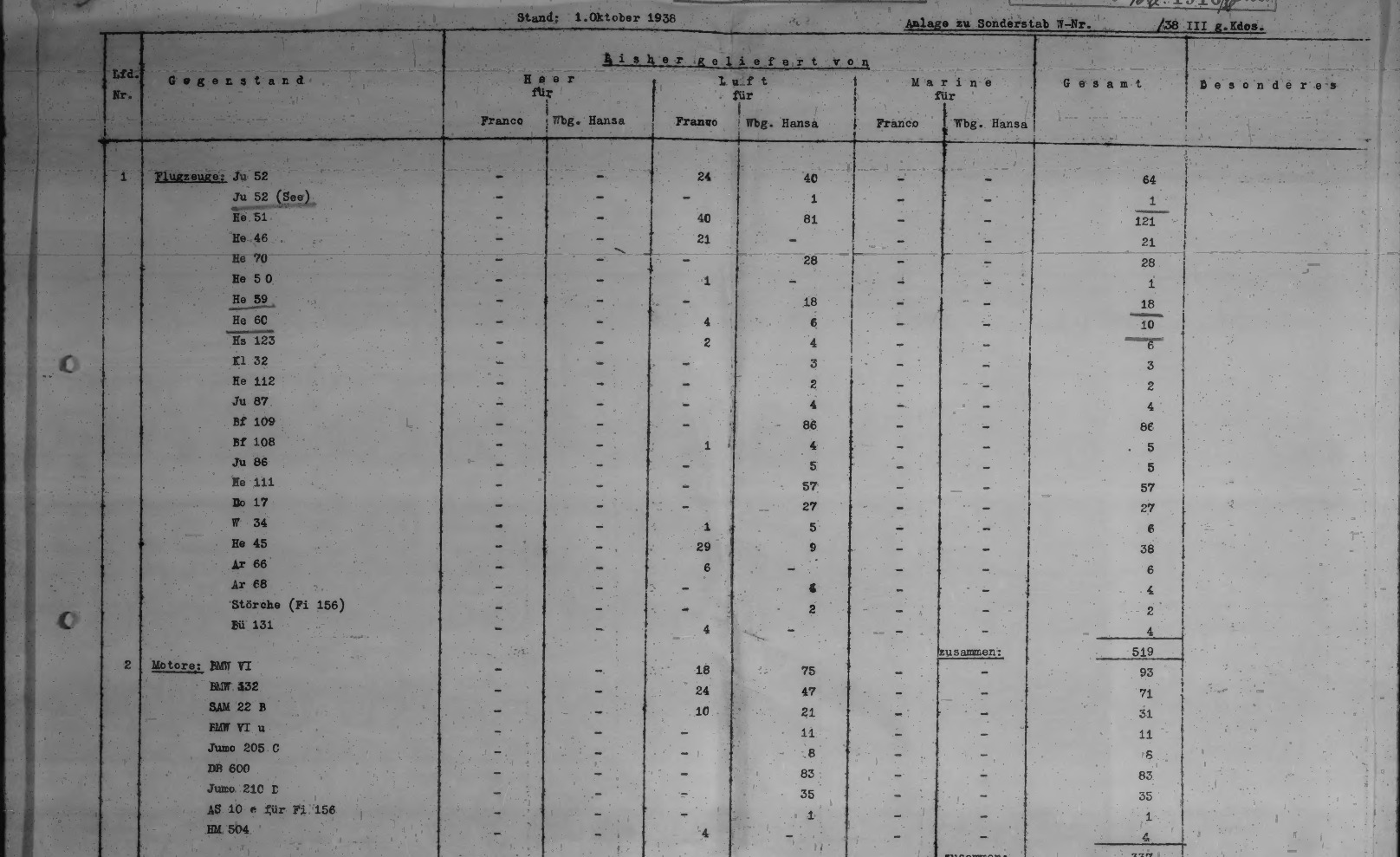 Document T1022, which contained a wealth of information, but unfortunately does not reveal to me the deliveries of aircraft or engines with the code OTTO. It only lists handguns and cannons, but nothing about the delivery dates of the first German aircraft.